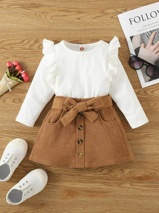 2 pcs Toddler Kids Baby Girl Ruffle Long Sleeve Sweatshirt Top Mini Pleated Skirt Set