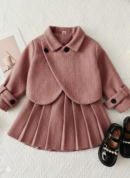 Girls' Autumn/Winter Casual Tweed Lapel Coat and Retro Pleated Skirt Two-Piece Set