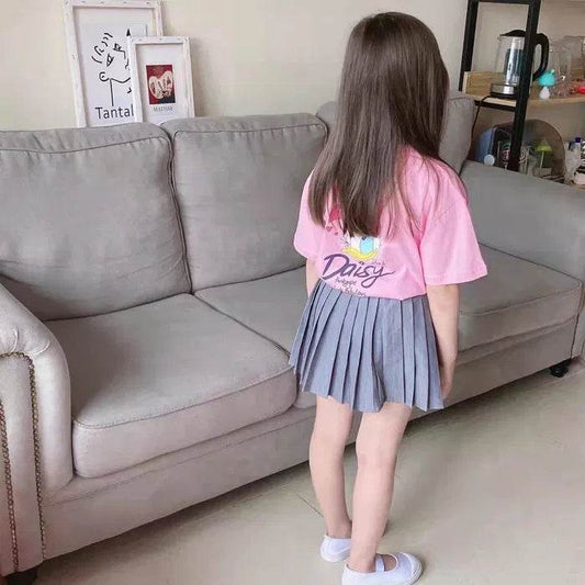 Young Girl's Cartoon Graphic T-shirt & Pleated Skirt
