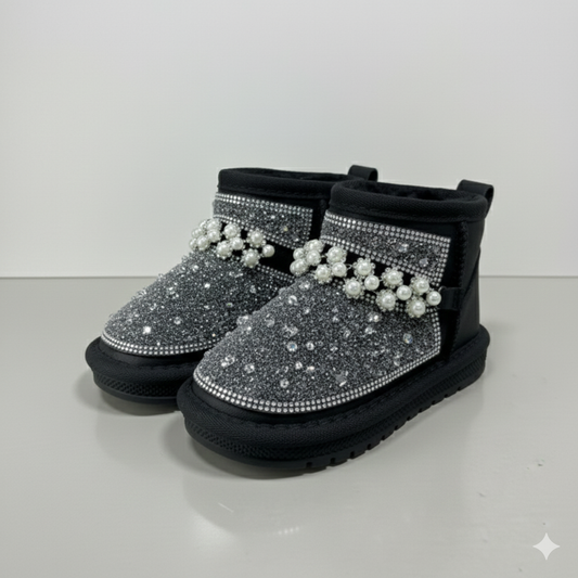Kids Winter Glitter Boots with Pearls – Warm Fur Lined Non-Slip Ankle Shoes for Girls,